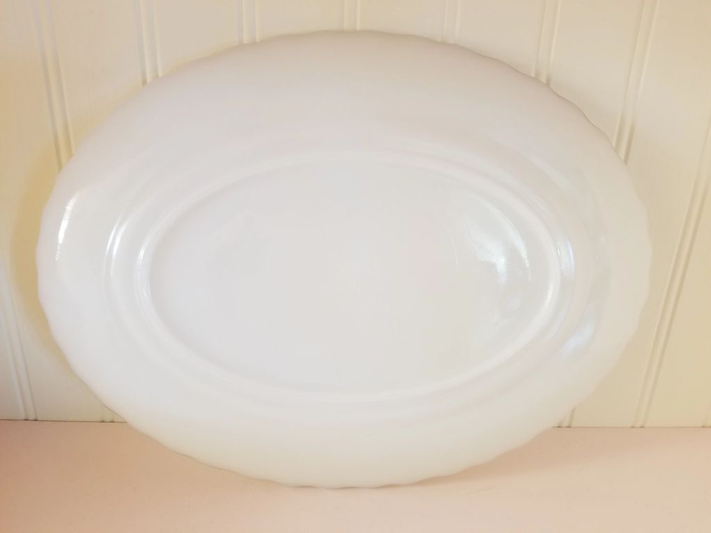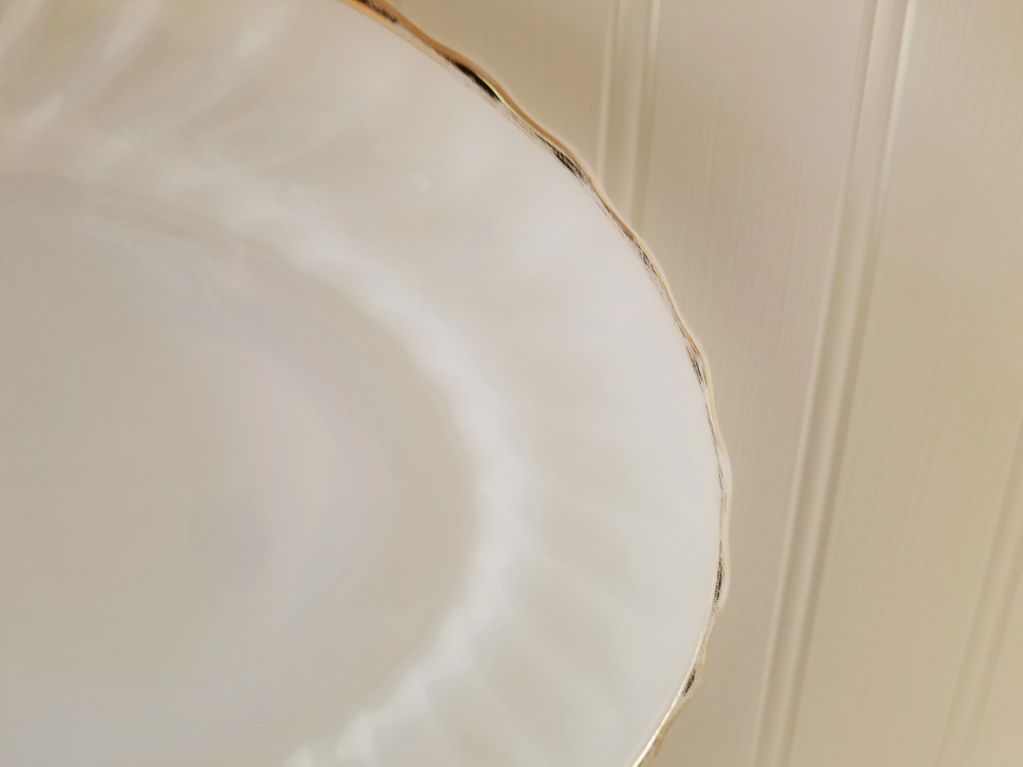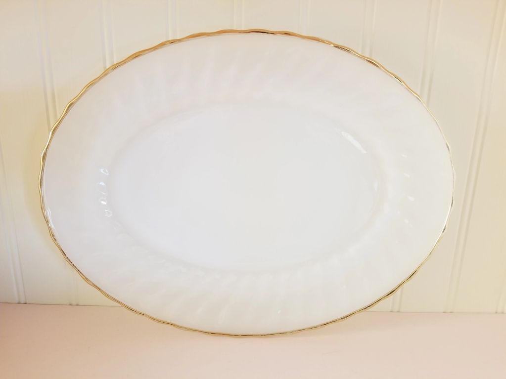 Vintage Oval Milk Glass Platter Swirled Rim and Trimmed in Gold by Anchor Hocking ~ $15